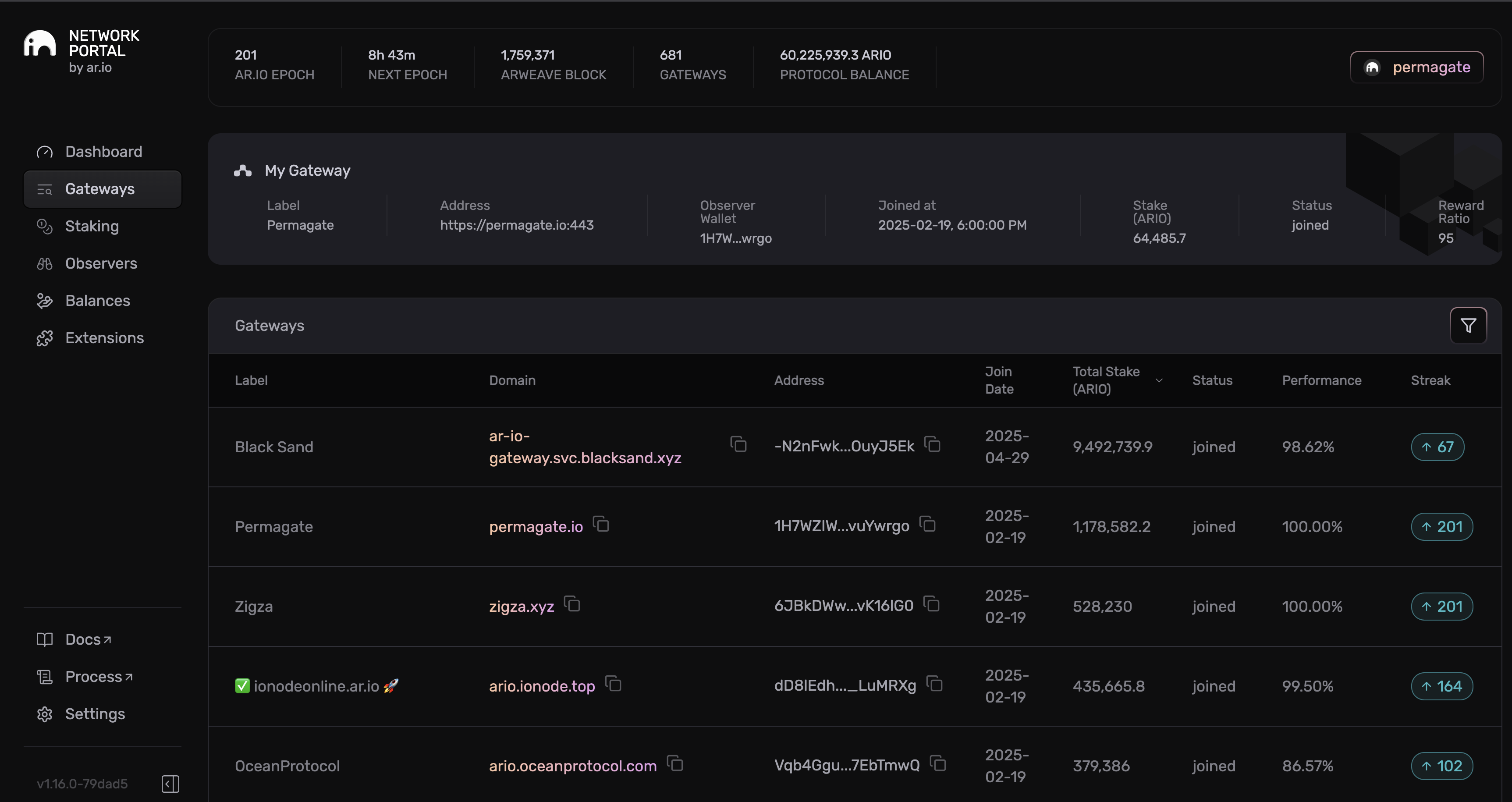 The gateways.ar.io portal displays all gateways currently in the network, showing their stakes, performance scores, and operational metrics