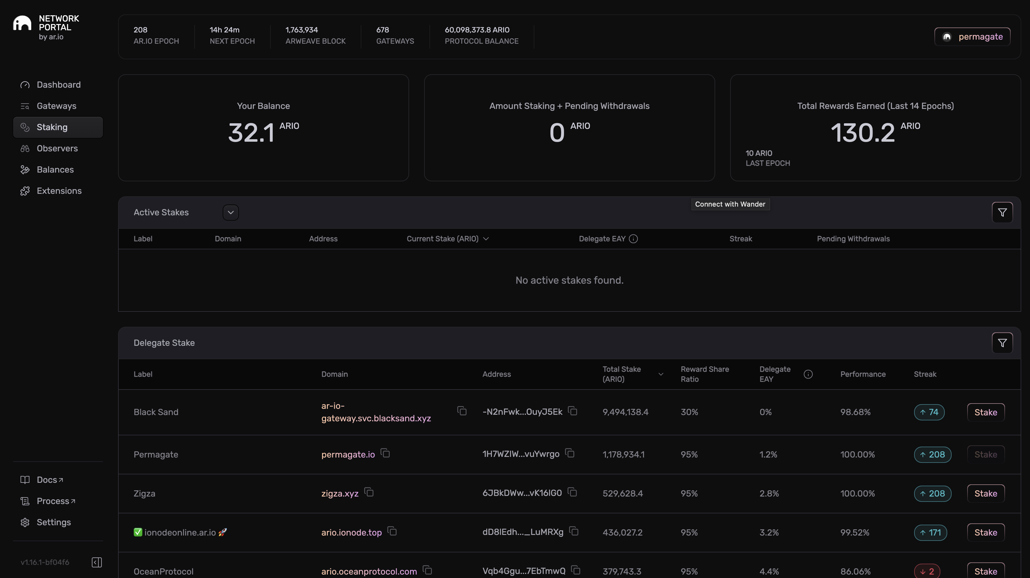 Delegators can select which gateways to stake with in gateways.ar.io - maximize their potential rewards based on operator performance, stakes, and weights